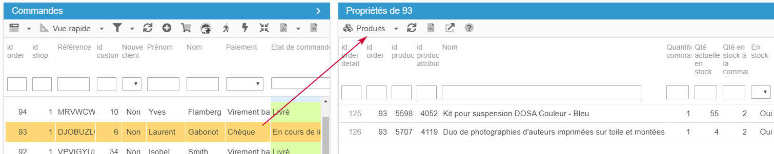 L'interface de gestion des Commandes dans Store Commander inclut une grille 'Produits' dans laquelle vous pouvez modifier certaines données liées à la commande préalablement sélectionnée dans le panneau central.