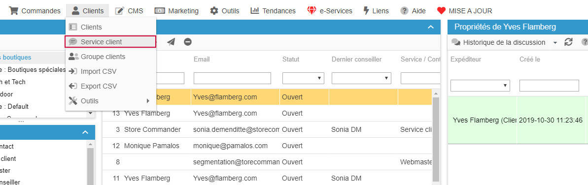Vous pouvez répondre à vos clients avec l'interface Service Clients de Store Commander, accessible depuis le menu Clients > Service Clients.