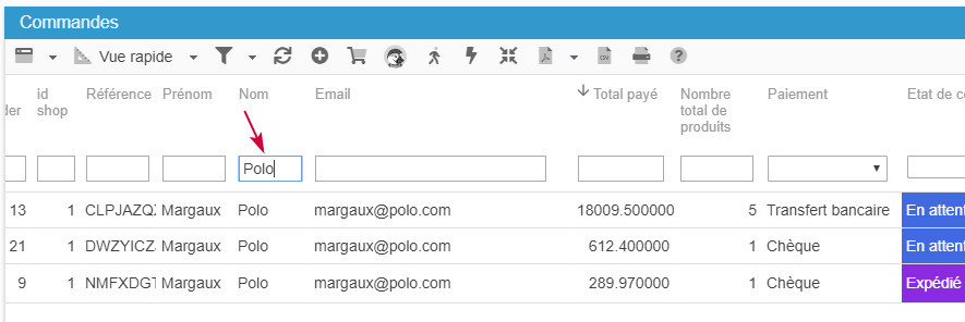 Depuis la vue Rapide par exemple, utilisez le filtre de la colonne ‘Nom’ pour y saisir le nom du client en question. Les commandes associées seront automatiquement affichées.