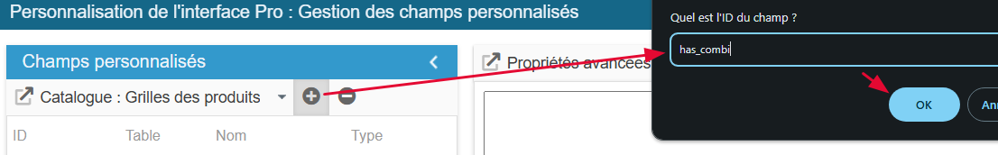 Clic sur l’icône d’ajout pour créer la ligne du nouveau champ et indiquez son ID has_combi
