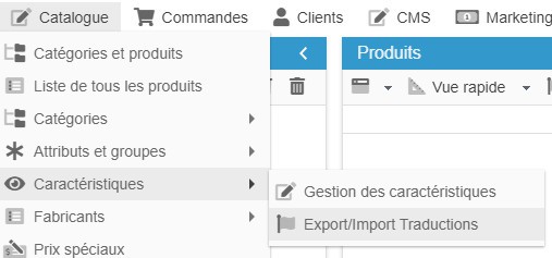 L'outil est accessible depuis le menu Catalogue > Caractéristiques > Export/Import Traductions.