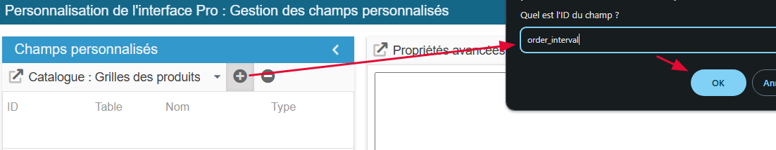 Clic sur l’icône d’ajout pour créer la ligne du nouveau champ et indiquez son ID order_interval
