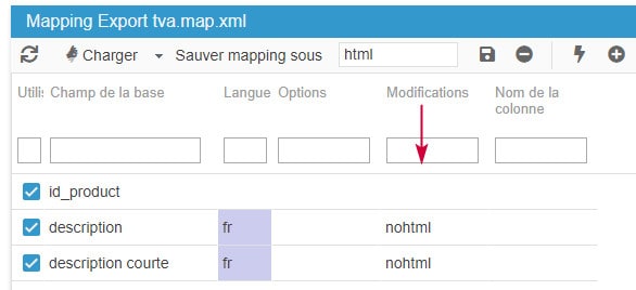 Pour exporter les descriptions dans un format sans les balises html, indiquez nohtml dans la colonne 'modifications'.