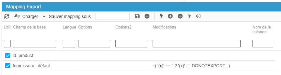 Pour obtenir la liste des produits qui n'ont aucun fournisseur associé, vous pouvez effectuer un export CSV avec Sc, en ajoutant la formule ci-dessous dans la colonne Modification du champ 'fournisseur - défaut' dans le mapping de votre export