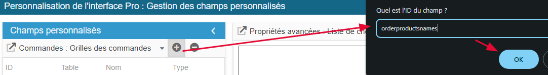 Cliquez sur l’icône d’ajout pour créer la ligne du nouveau champ et indiquez son ID: orderproductsnames
