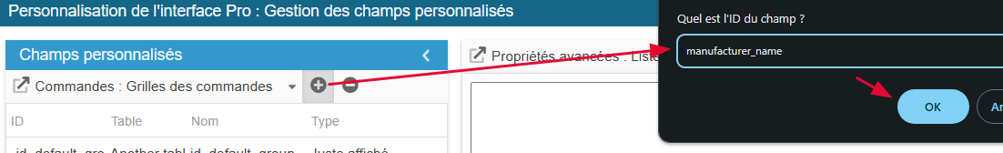 Clic sur l’icône d’ajout pour créer la ligne du nouveau champ et indiquez son ID manufacturer_name