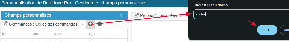 Clic sur l’icône d’ajout pour créer la ligne du nouveau champ et indiquez son ID ecotax
