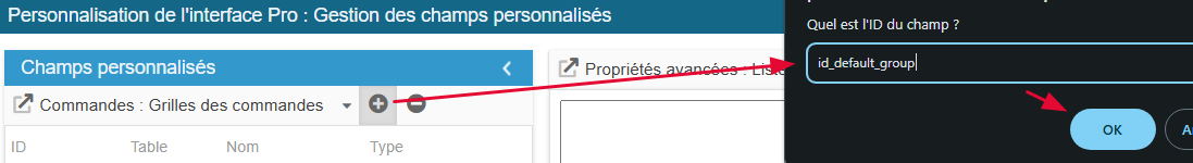 Clic sur l’icône d’ajout pour créer la ligne du nouveau champ et indiquez son ID id_default_group