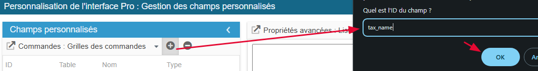 Clic sur l’icône d’ajout pour créer la ligne du nouveau champ et indiquez son ID tax_name