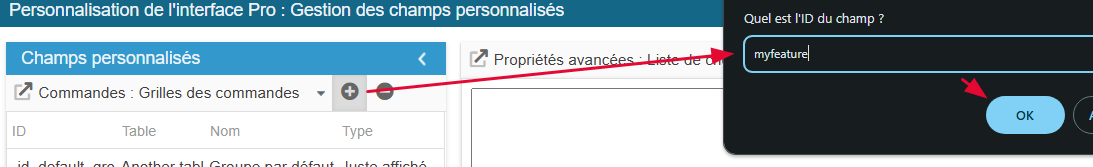 Clic sur l’icône d’ajout pour créer la ligne du nouveau champ et indiquez son ID myfeature