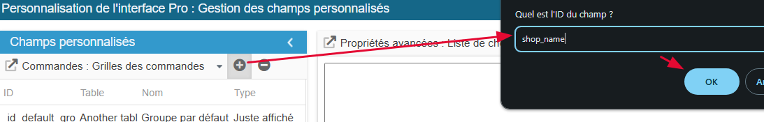 Clic sur l’icône d’ajout pour créer la ligne du nouveau champ et indiquez son ID shop_name