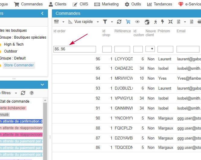 L'outil de filtres de l'interface des commandes, notamment pour la colonne id_order, vous permet d'utiliser plusieurs opérateurs pour afficher une plage de commandes.