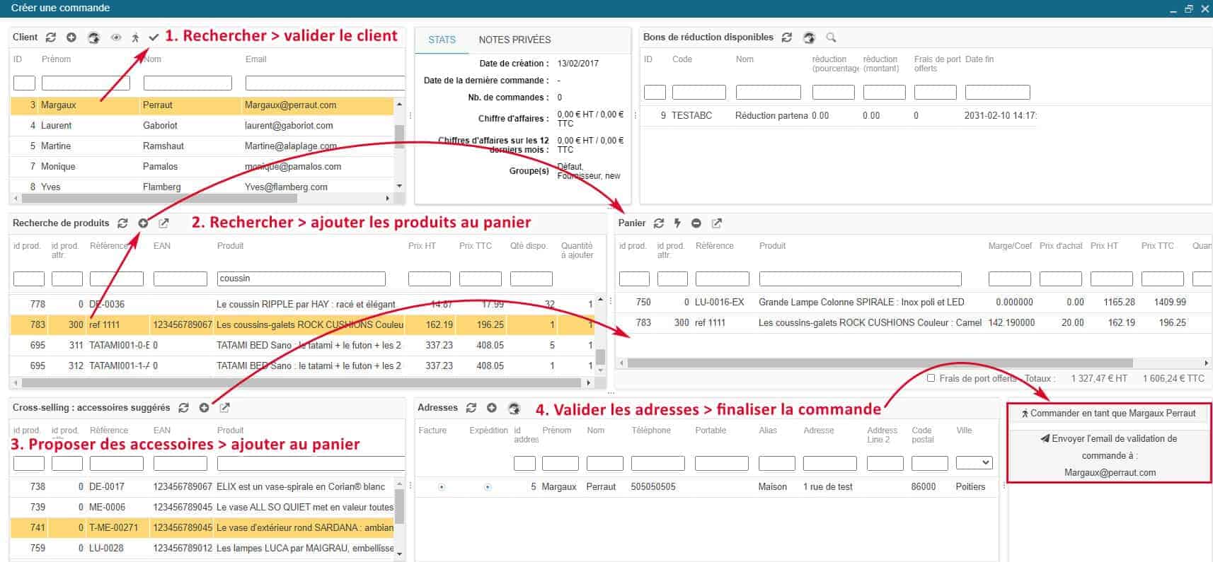 La gestion des commandes dans Store Commander intègre un outil très pratique permettant de se connecter au panier d'un client en un clic.