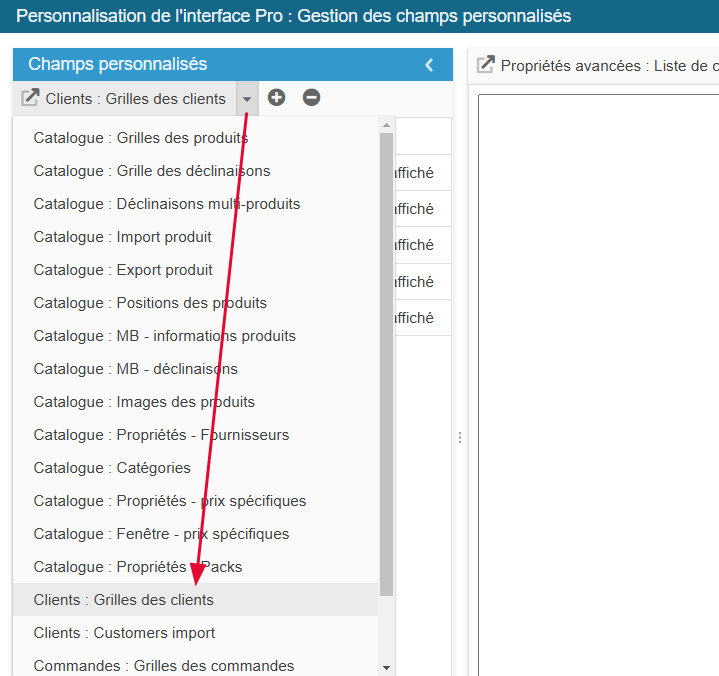 Assurez-vous de bien choisir la grille dans laquelle vous voulez ajouter votre champ - dans cet exemple, il s’agira de ‘Clients : Grilles des Clients’ :