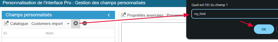 Cliquez sur l’icône d’ajout pour créer la ligne du nouveau champ et indiquez son ID my_field