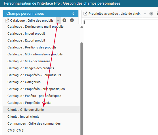Assurez-vous ensuite de bien choisir la grille dans laquelle vous voulez ajouter votre champ, en l’occurrence ici la Grille des Clients.