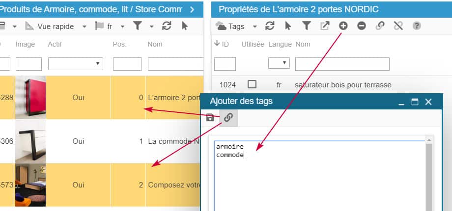 Une autre option utile matérialisée par cette icône sur la barre d'outils, permet d'identifier les produits liés au tag sélectionné dans la liste. Sélectionnez un tag et cliquez sur cette icône pour afficher les produits associés sur votre front office.