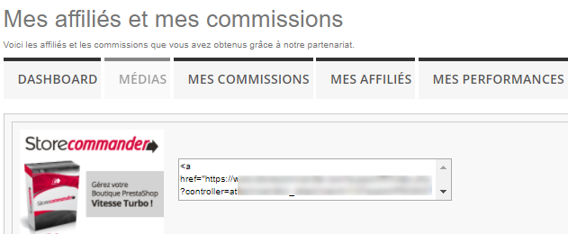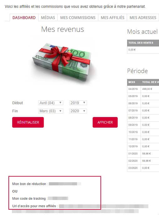 Le partenaire peut voir l'URL de tracking utilisée et/ou le code du bon de réduction configurés par le marchand sur le tableau de bord (tableau de bord).