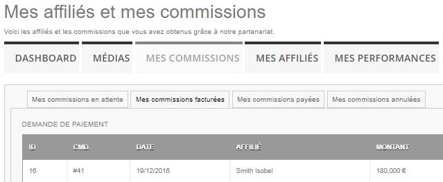 C'est à cet endroit que le partenaire peut consulter le détails de ses commissions : en attente, facturées, payées et annulées.