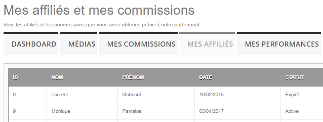 Le partenaire peut consulter la liste de ses affiliés à cet endroit.