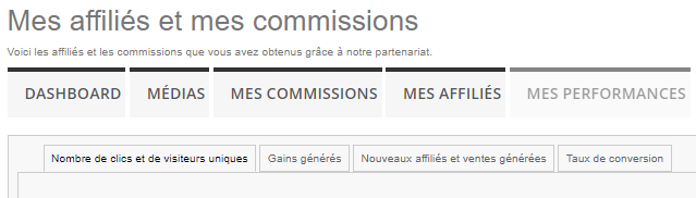 Le partenaire se connecte à son compte sur le site du marchand pour ensuite sélectionner 'Mes Affiliés et Mes Commissions'. La page d'accueil affichera 5 onglets : tableau de bord, médias, commissions, affiliés et performances.