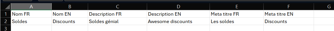 L'option de langues est disponible pour les champs 'nom', 'description' et tous les champs ‘meta’. Il suffira d'insérer une colonne pour chaque langue comme dans cet exemple :
