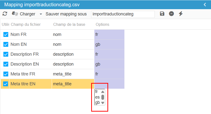 Le choix de langues se trouve dans la colonne ‘Options’ du mapping :