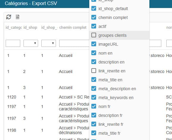 Vous pouvez aussi filtrer les données par colonne si vous souhaitez exporter uniquement les catégories associées à un groupe clients spécifique, ou encore uniquement les catégories actives, etc.