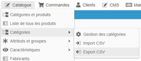 L'export CSV pour les catégories est accessible depuis le menu Catalogue > Catégories > Export CSV.