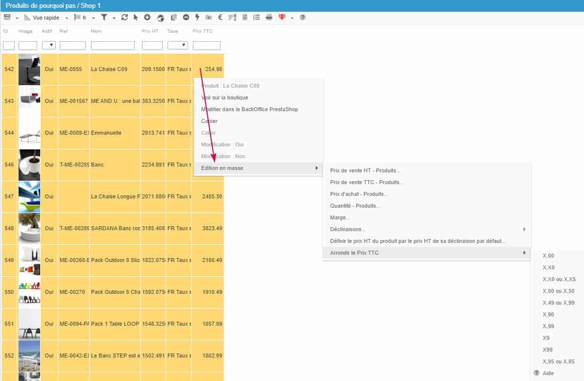 Les options d’édition en masse de ce menu contextuel vous propose également d’arrondir les prix de vos produits, en suivant le même principe c’est à dire applicable sur une sélection de produits.