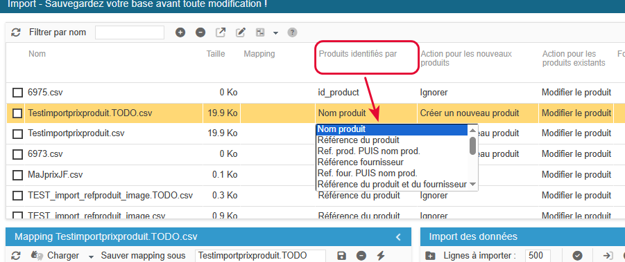 L’élément le plus important dans un import est l’identifiant qui permettra de retrouver et mettre à jour le produit concerné.