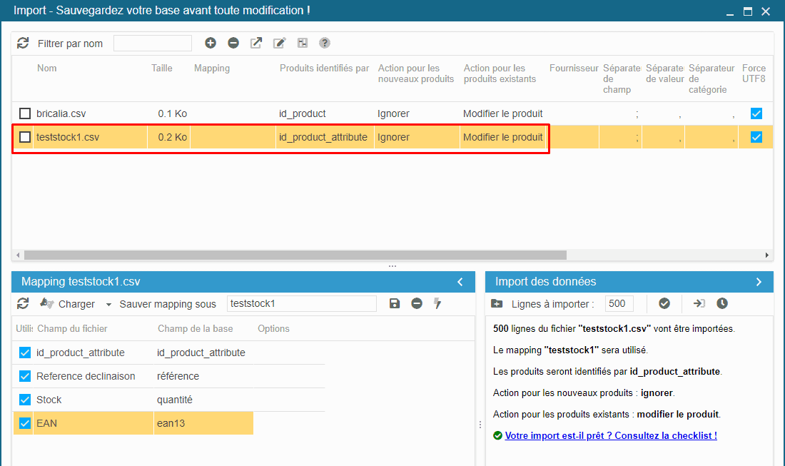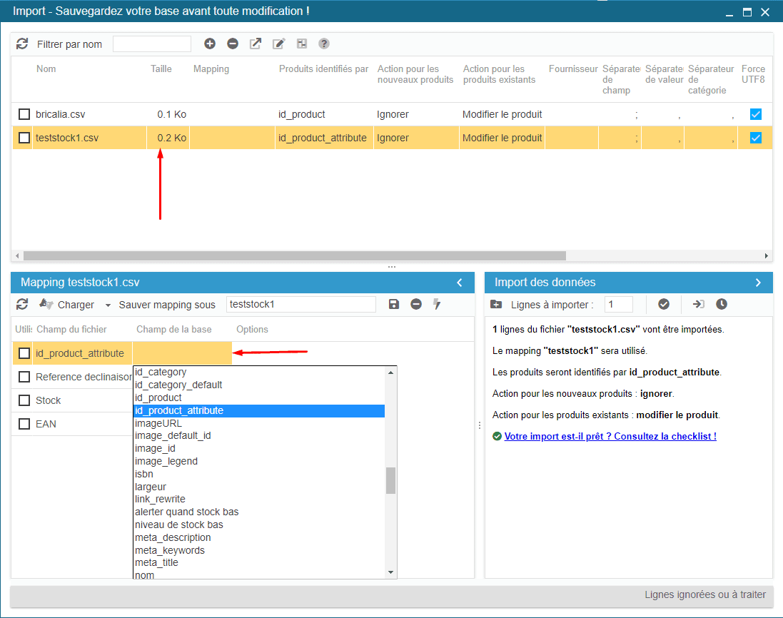 Dans cet exemple, le but ici est de mettre à jour les quantités de mes déclinaisons ainsi que la référence et l'ean13, les actions à choisir seront alors ‘ignorer’ + ‘modifier’