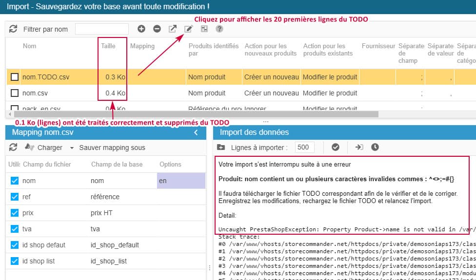 Dès que vous démarrez le processus d'import, Store Commander créé automatiquement une copie de votre fichier CSV intitulé 'votrefichier.TODO.CSV'.
