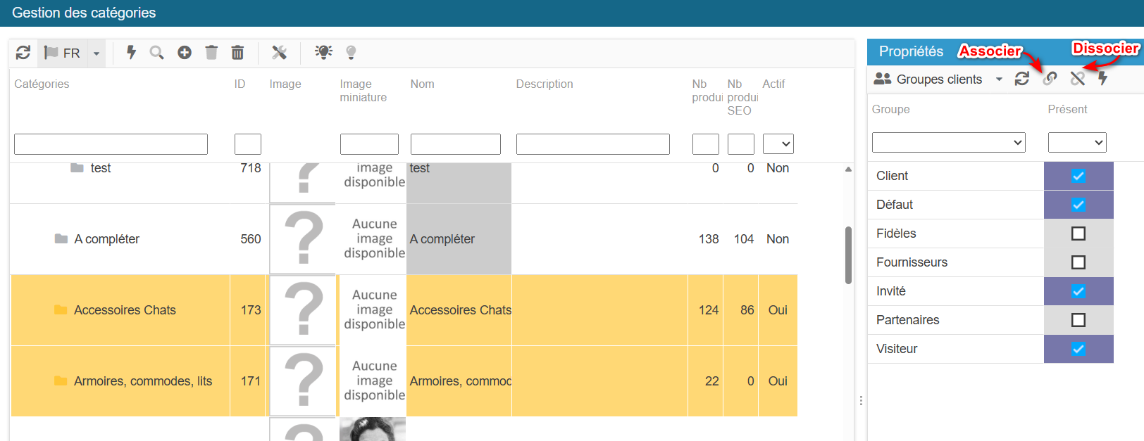 Dans la grille des Groupes Clients, cochez ou décochez les cases correspondantes pour associer ou dissocier les groupes aux catégories sélectionnées.