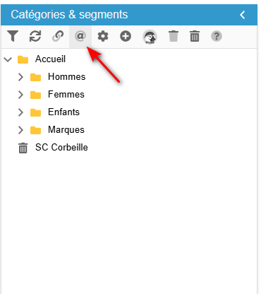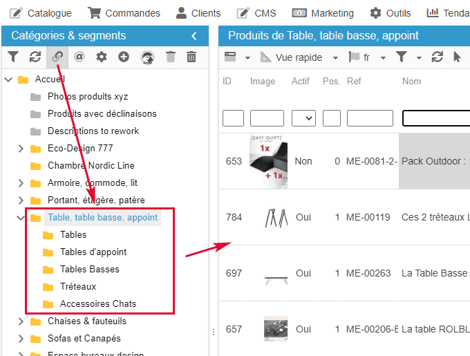 Dans le cas de catégories parentes et sous-catégories, il est possible d'afficher les produits contenus dans toutes les sous-catégories (d'une même catégorie parente) sans avoir à sélectionner les sous-catégories une à une. Pour cela, activez l'option 🔗qui se trouve sur la barre d'outils des catégories et sélectionnez la catégorie parente.