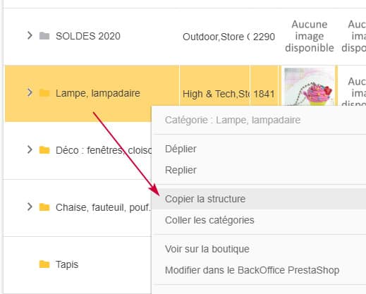 Après avoir sélectionné la catégorie parente concernée, faites un clic droit pour afficher le menu contextuel et sélectionnez 'Copier la structure'.