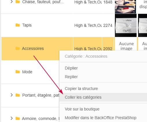 Sélectionnez ensuite la catégorie dans laquelle vous souhaitez ajouter les catégories précédemment copiées, clic droit pour afficher le menu contextuel et sélectionnez 'Coller les catégories'.