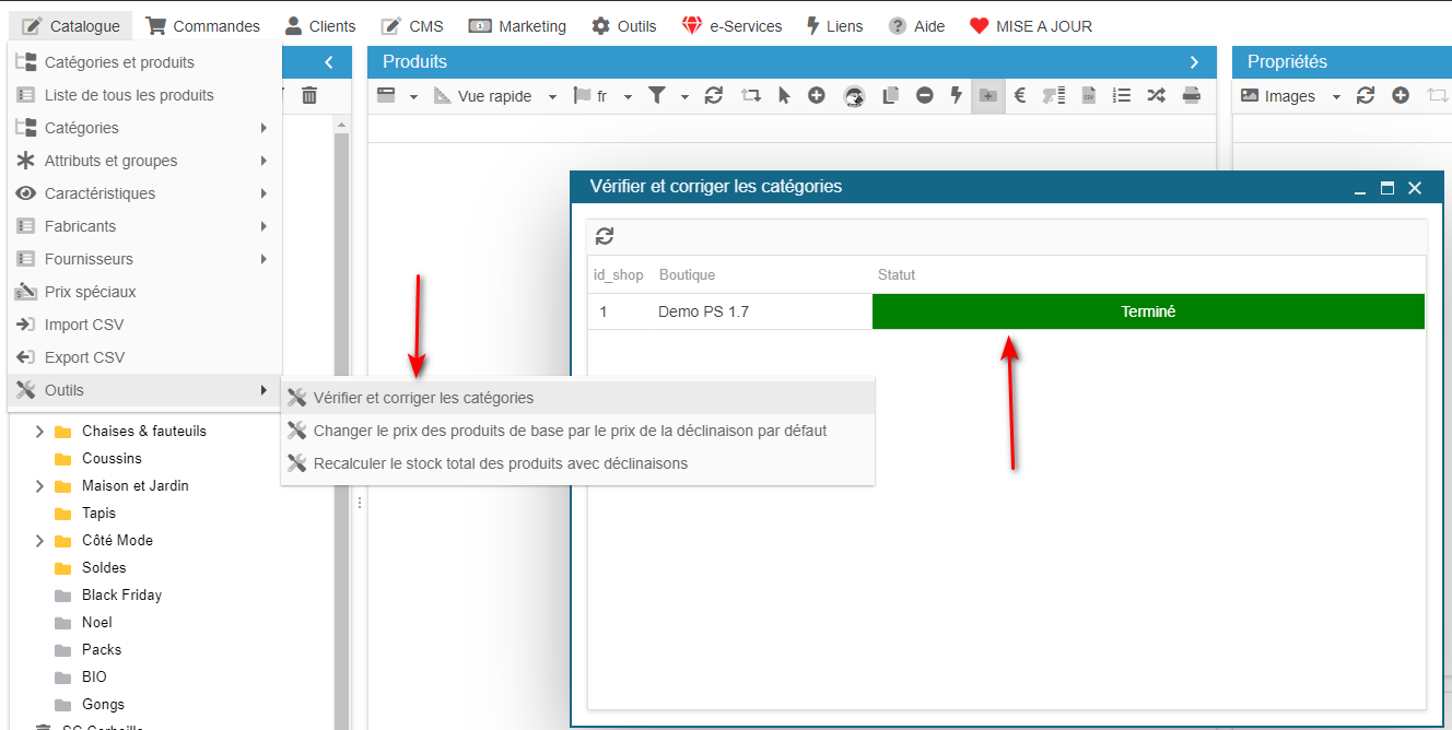 L'option 'Vérifier et corriger les catégories' que vous retrouverez dans le menu Catalogue > Outils ainsi que dans l'interface dédiée aux catégories (menu Catalogue > Catégories) permet de vérifier des informations spécifiques des catégories en base de données.