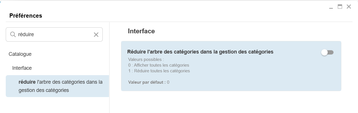 Vous avez la possibilité d'afficher cette arborescence repliée si vous le souhaitez en modifiant l'option correspondante dans SC > Outils > Préférences > Catalogue > Interface > Réduire l'arbre des catégories.