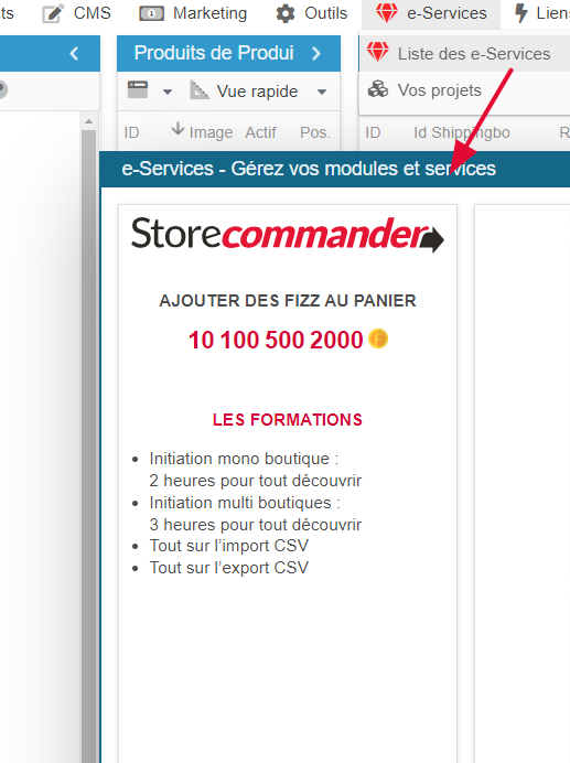 Vous pouvez acquérir des Fizz directement dans l'interface de Store Commander, menu e-Services > Liste des e-Services
