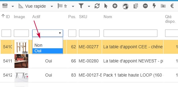 Vous pouvez ainsi filtrer la liste des produits pour, par exemple, afficher uniquement les produits activés, en sélectionnant 'Oui' dans le menu déroulant de la colonne Actif :