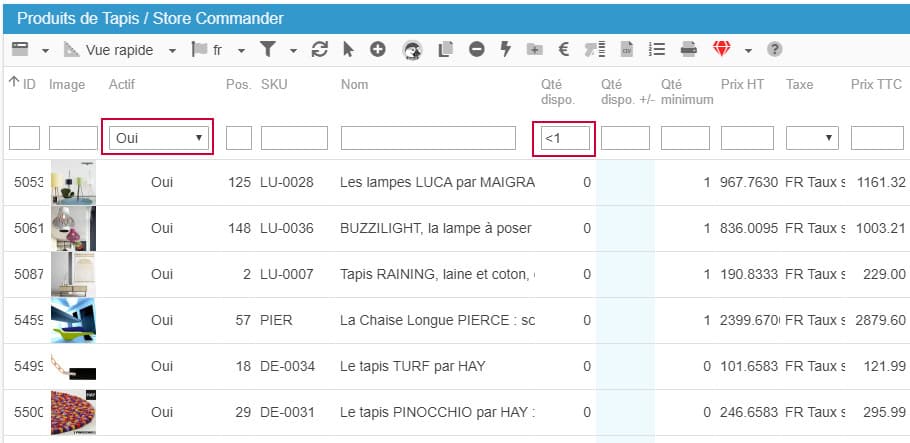 Tous les filtres sont cumulatifs, vous pouvez donc aussi utiliser le filtre des 'Quantités dispo' pour afficher les produits activés dont le stock est inférieur à 1 par exemple :