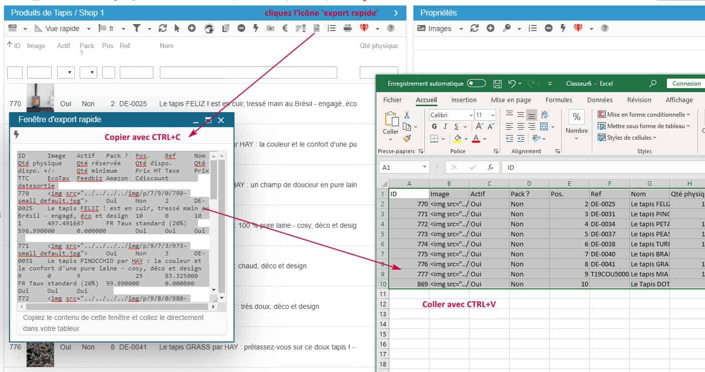 Voilà, la grille de Store Commander est maintenant sur votre feuille Excel, OpenOffice ou autre tableur.