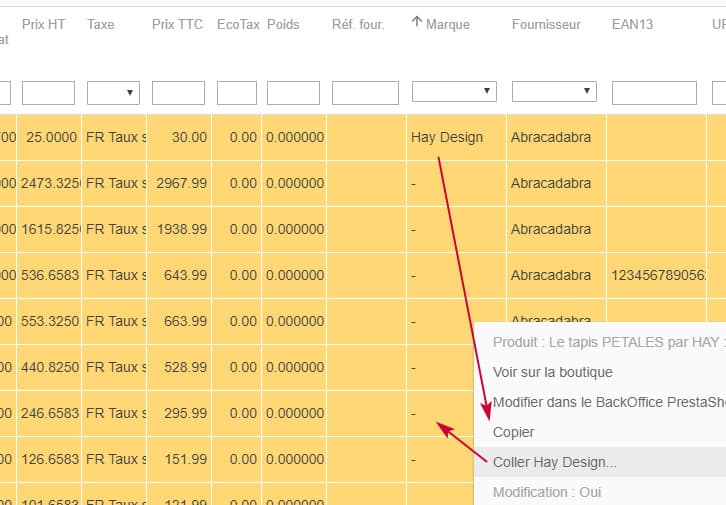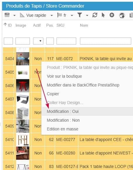 Autre exemple, vous pouvez activer toute une gamme de produit avec le même copier/coller, ou encore plus rapidement en utilisant l'option du menu contextuel 'Modification : Oui' ou 'Modification : Non'.