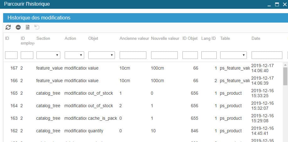 Toutes les modifications manuelles effectuées (80%) dans l'interface Store Commander sont enregistrées dans l'Historique des modifications, accessible depuis le menu Outils.