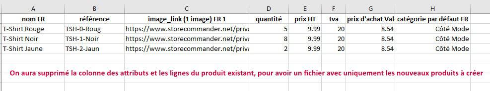 Dans la colonne NOM, nous créons le nom des 3 nouveaux produits (nom + attributs) et glissons les autres données sur les lignes des nouveaux noms :